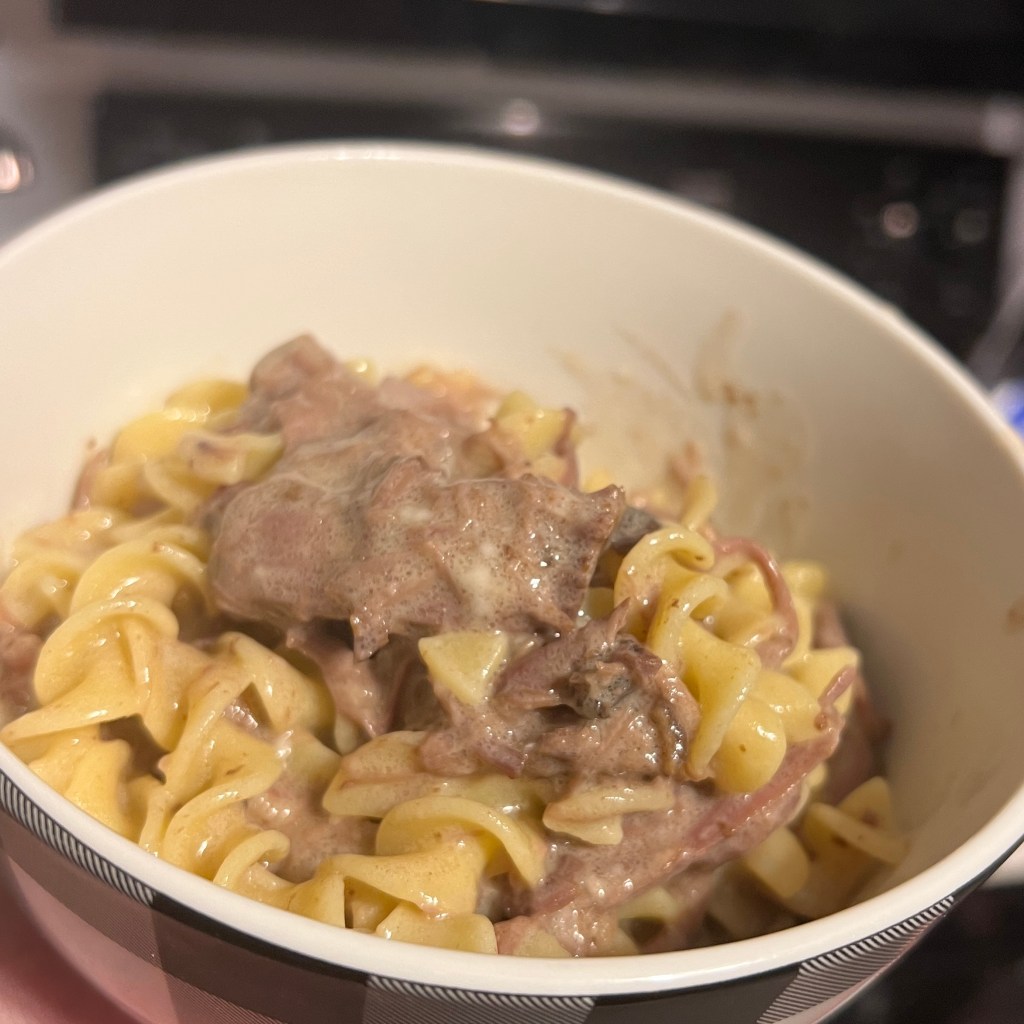 - When the noodles are close to al dente, remove lid on the meat and add the mushroom soup and sour cream. Mix it all together until it is all combined.